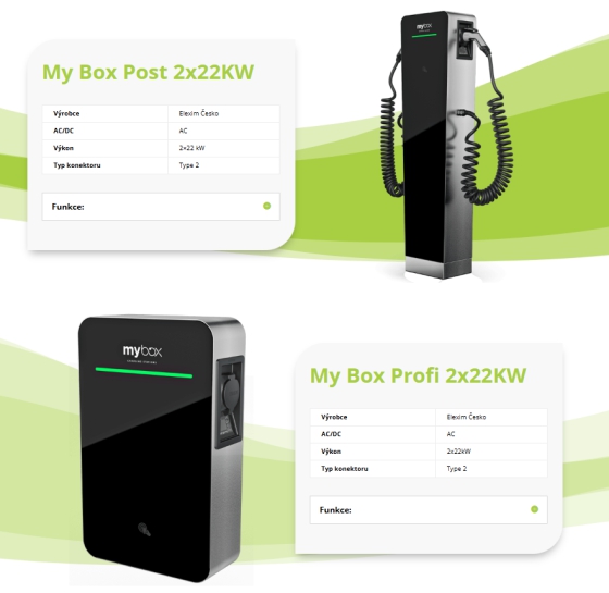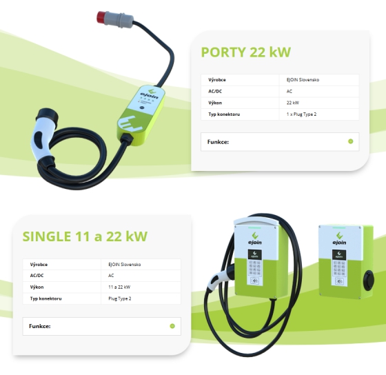 Nabíjecí stanice na stěnu: 1 x 22 kW | Maximální pracovní výkon: 22 kW | Pracovní proud: 32A – 3 fáze | Délka kabelu: 5 m